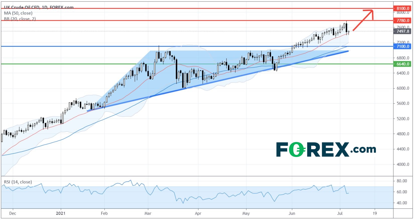 在日线图上,英国原油CFD曾挑战顶头阻力位7,780点,并同时得到正在上升中的20日移动均线所提供的有力支持。