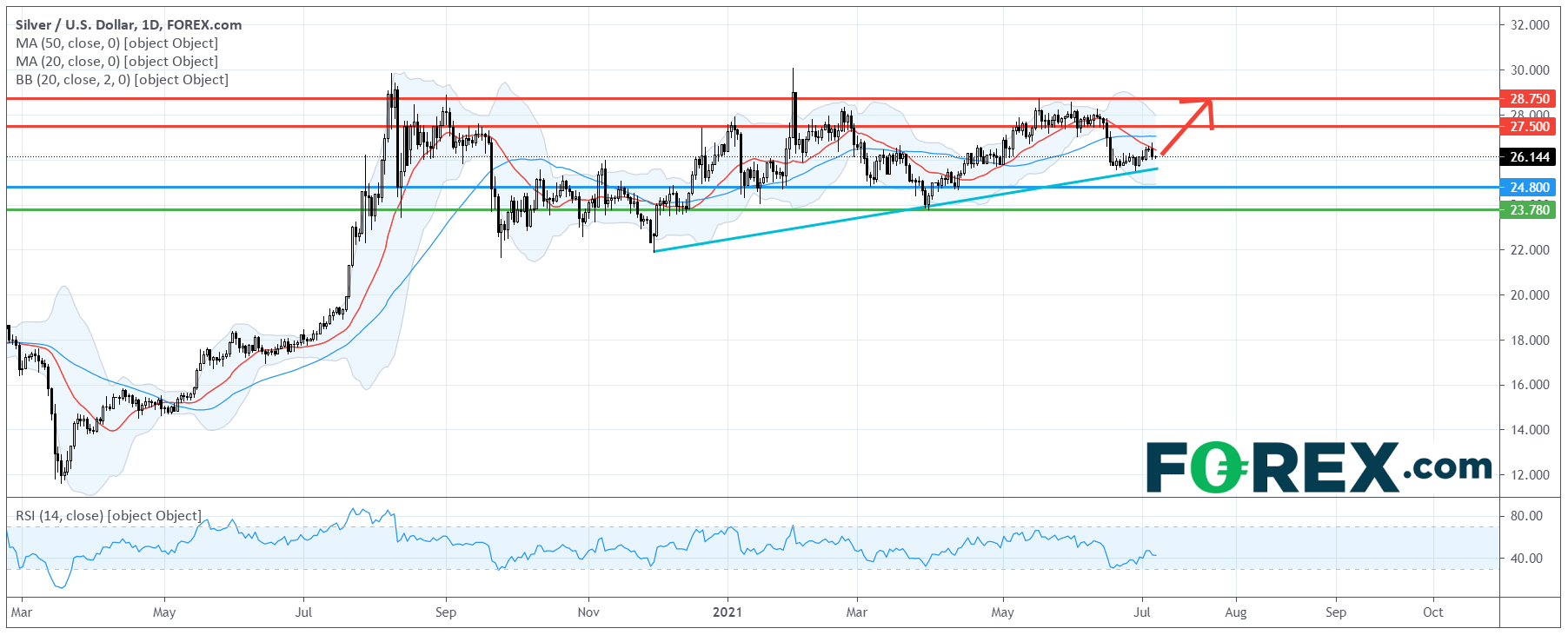 在日线图上,现货白银仍在尝试站稳阵脚。目前,去年11月以来的上升趋势线依然有效,价格正在挑战20日移动均线。