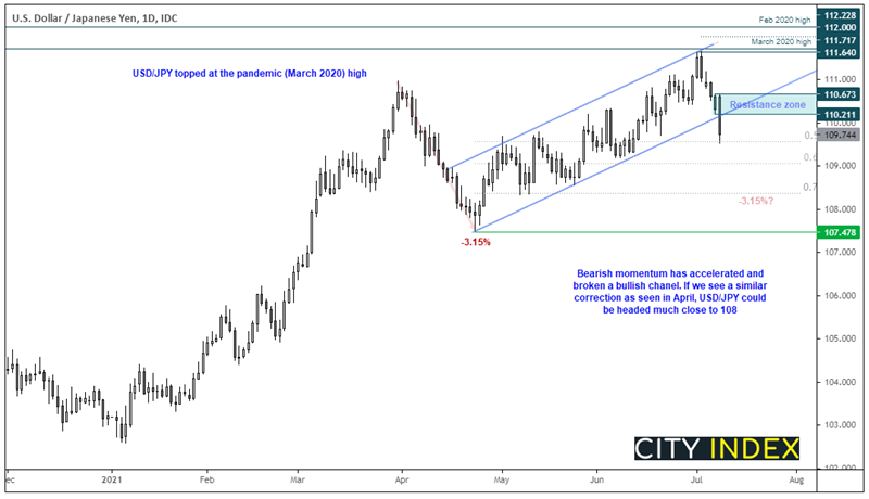 我们也注意到美元/日元在2020年3月高点(也是疫情高点)筑顶,并且下跌动能升级,导致价格的上涨通道失效。我们把美元/日元置于4月份发现,该货币对在4月份的前三周回撤3.15%。所以,如果7月出现相似幅度的回撤,美元/日元可能跌至108.11附近。