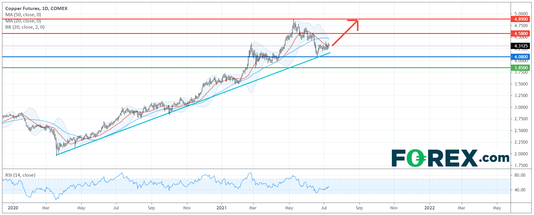 从技术角度看,如日线图所示,芝商所铜期货的长线上升趋势依然稳健。此前价格的下滑并没有破坏去年3月以来的上升趋势线。目前,价格已回到20日移动均线的上方。