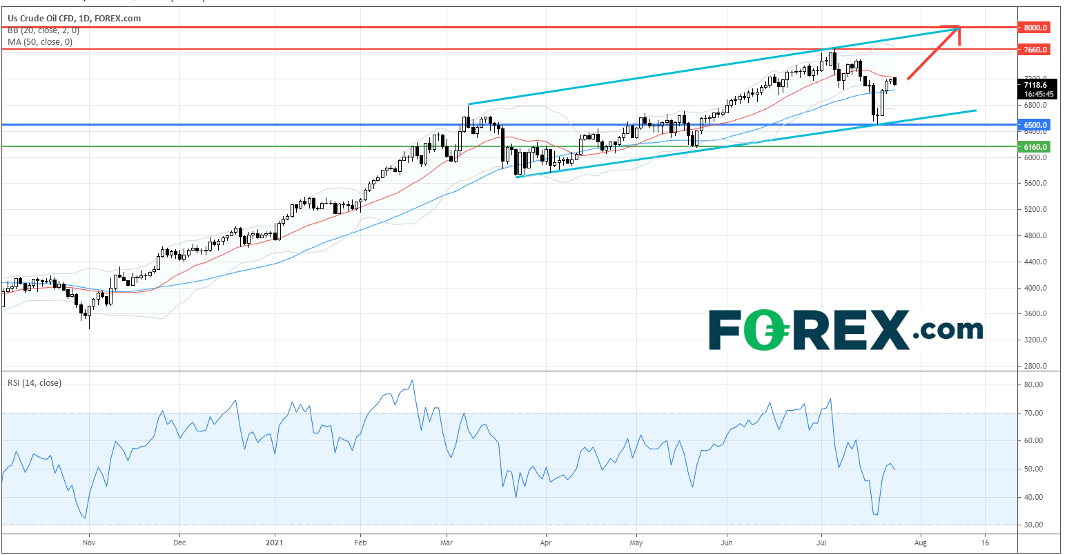 只要之前的低位6,500点仍被视作主要支持(止损)位,料美国原油CFD将再试5月高位7,660点和下一道阻力位8,000点的大关。