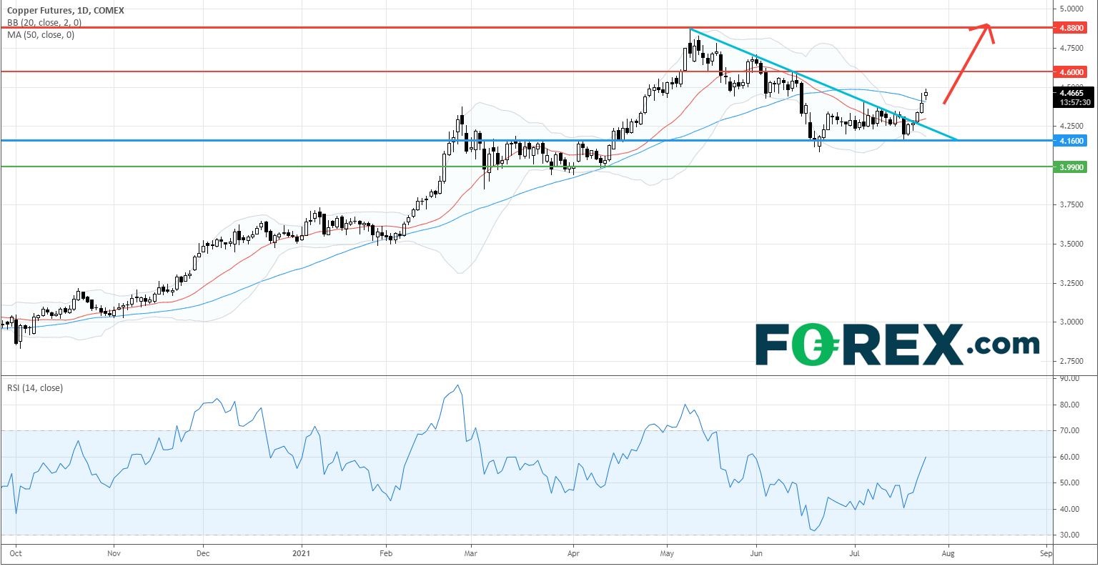 在日线图上,芝商所铜期货 (连续合约) 由6月低位反弹并升穿了一条由5月高位拉出的下降趋势线。目前,20日均线已经转为上升,相对强弱指数亦升穿50的中性水平。