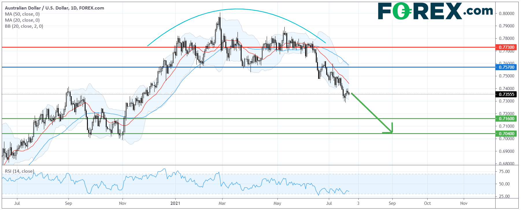 在日线图上,澳元/美元的技术走势持续走弱。此前,它形成了一个圆形顶部后跌破颈线,20日移动均线加速下滑并远离50日移动均线。
