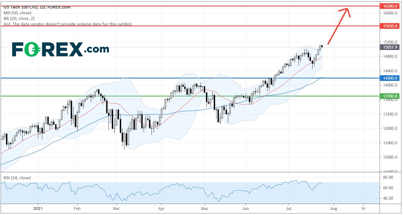 前周,环球股市受冠状病毒叁角洲变种 (Delta Variant) 传播的影响而普遍向下,美国科技股100指数CFD 只调整了约4%。上周,指数作强劲反弹,升穿15,000点,再创新高。