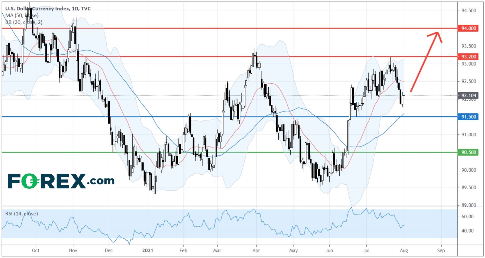 在日线图上,美元指数在7月中旬突破93.00水平后,进入了一个整固阶段。目前,指数已跌破了20日移动均线。