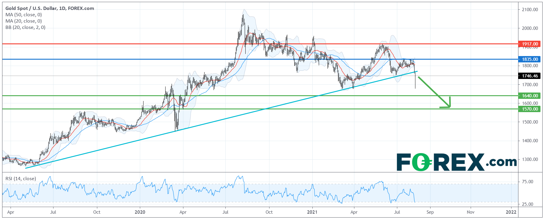在日线图上,现货黄金的技术走势反转向下。此前它未能上破50日移动均线,现在跌破了2019年5月以来的上升趋势线。