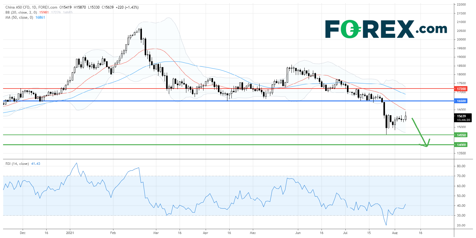 在日线图上,中国A50指数CFD由7月低位反弹约2%,但目前仍在下行的20日均线之下操作。相对强弱指数仍在卖出区间30至50之间。