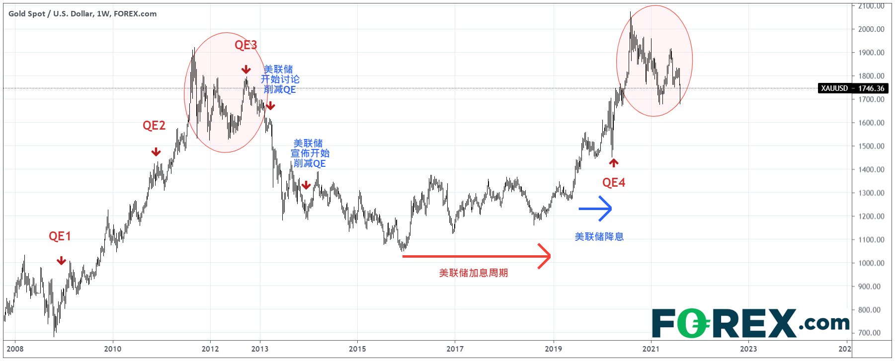 现货金价2008年至2021年走势与美联储局货币政策周期: