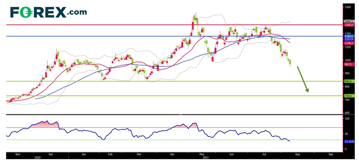 铁矿石期货价格已跌穿支持位985元人民币 (5月低位),正向另一下行目标840元人民币 (3月低位) 进发。