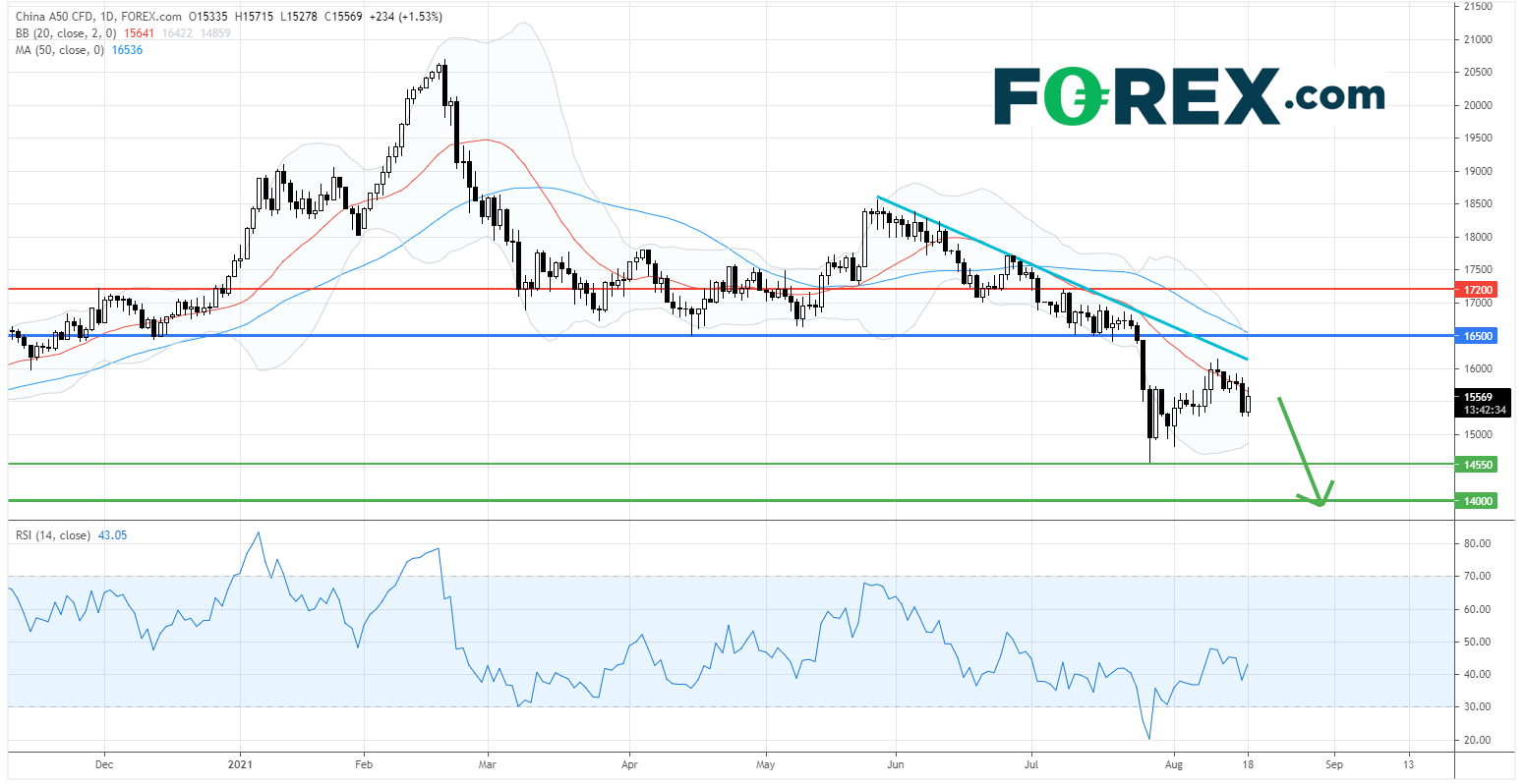中国A50指数CFD自7月低位反弹近9%,但指数昨日 (8月16日) 却急跌近2%,因中国市场监管总局发布《禁止网络不正当竞争行为规定(公开徵求意见稿)》,科技股的沽压再现并拖累市场气氛转淡。