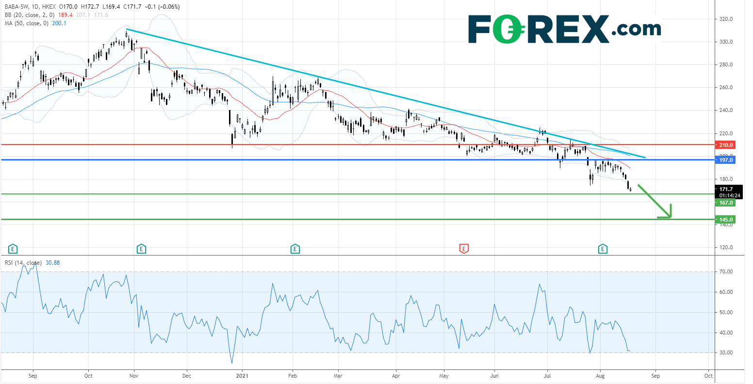 中国科技巨头 阿里巴巴 (9988.HK) 由年高位已经回落超过40%,市场预期中国政府的监管审查会使中国科技股公司的盈利增长变得不确定,並导致股票估值下降。