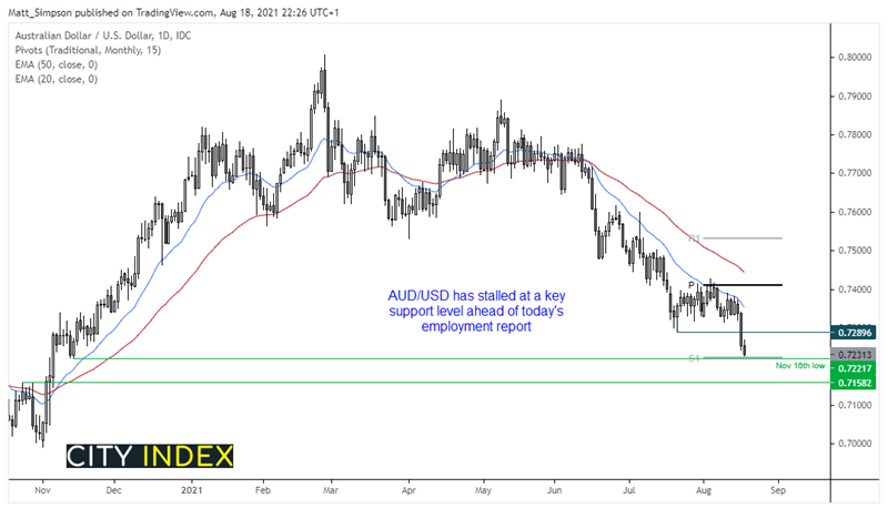 澳大利亚在11:30 AEST发布7月就业报告。澳洲联储在8月会议记录中表示,准备在有必要的时候行动。所以,一旦该数据令人失望,空头可能借机打压澳元。在维多利亚州和新南威尔士州的封锁时间延长的背景下,失业率料8个月中首度上升(从4.9%升至5%),就业岗位料减少4.25万。