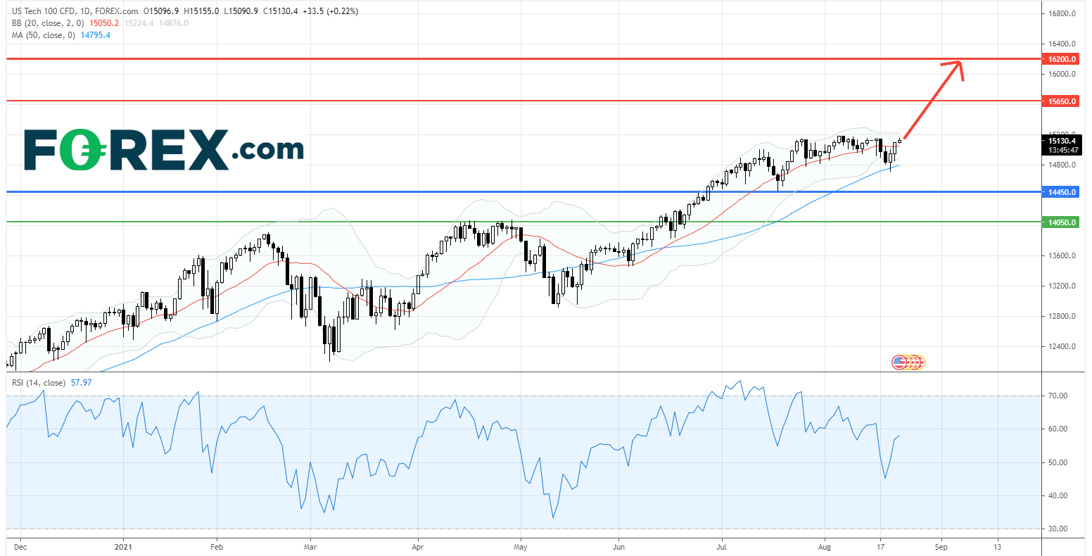 在日线图上,美国科技股100指数CFD升至近期高位15,190点后稍作整固。目前,一浪高于一浪的上升走势仍未被破坏,所以在技术上指数仍然维持看涨。