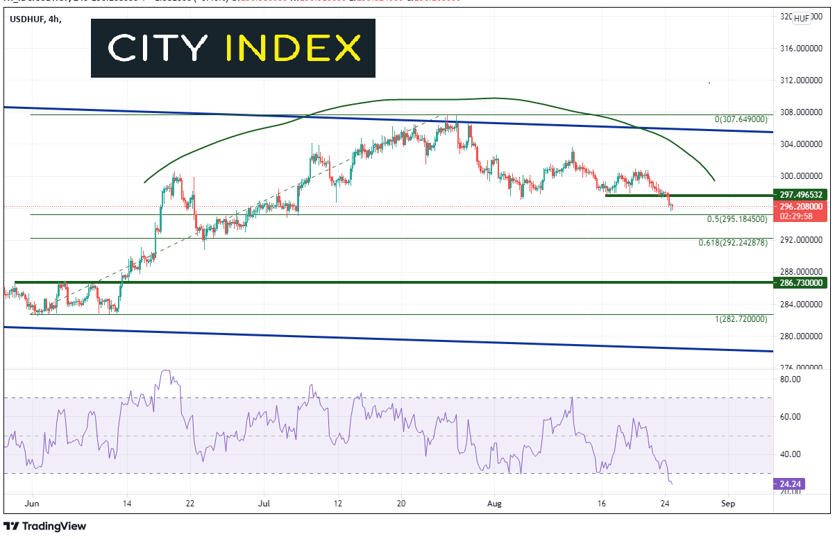 自2020年5月以来,美元/匈牙利福林一直交投于有序下行通道中。7月下旬,货币对测试通道顶部趋势线307.6490附近但未能穿透,回落至通道内部。请注意,在进入这些高点时,RSI开始与价格背离。在加息预期及随之而来的鹰派情绪影响下,美元/匈牙利福林过去2天下跌了1.02%,失守200天均线切入位297.5725。汇价正逼近295.1845附近6月1日低点至7月22日高点上行之50%回档以及水平支撑位。下方不远处292.2429附近可见61.8%回档位。