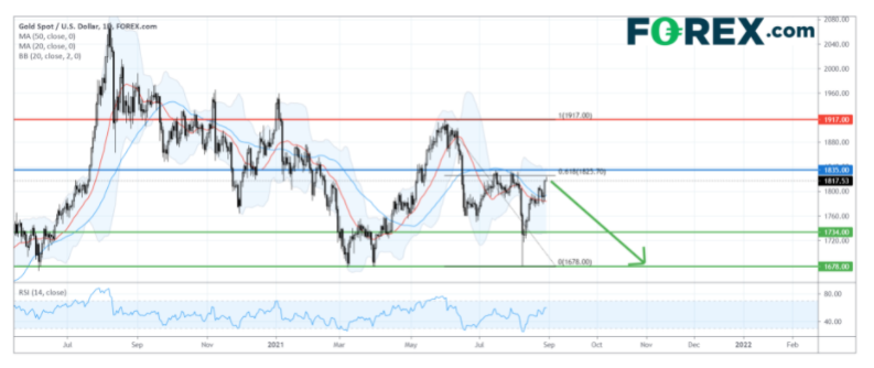 在日线图上,现货黄金技术走势迫近关键阻力。目前它仍未越过8月份高点,并受制于始于6月的跌势的61.8%费波纳奇回档位。