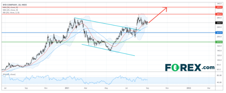 从技术角度看,如日线图所示,比亚迪股价走势依然坚挺。此前,它上破了1月以来的下降通道,目前正在上升的50日移动均线提供支撑。