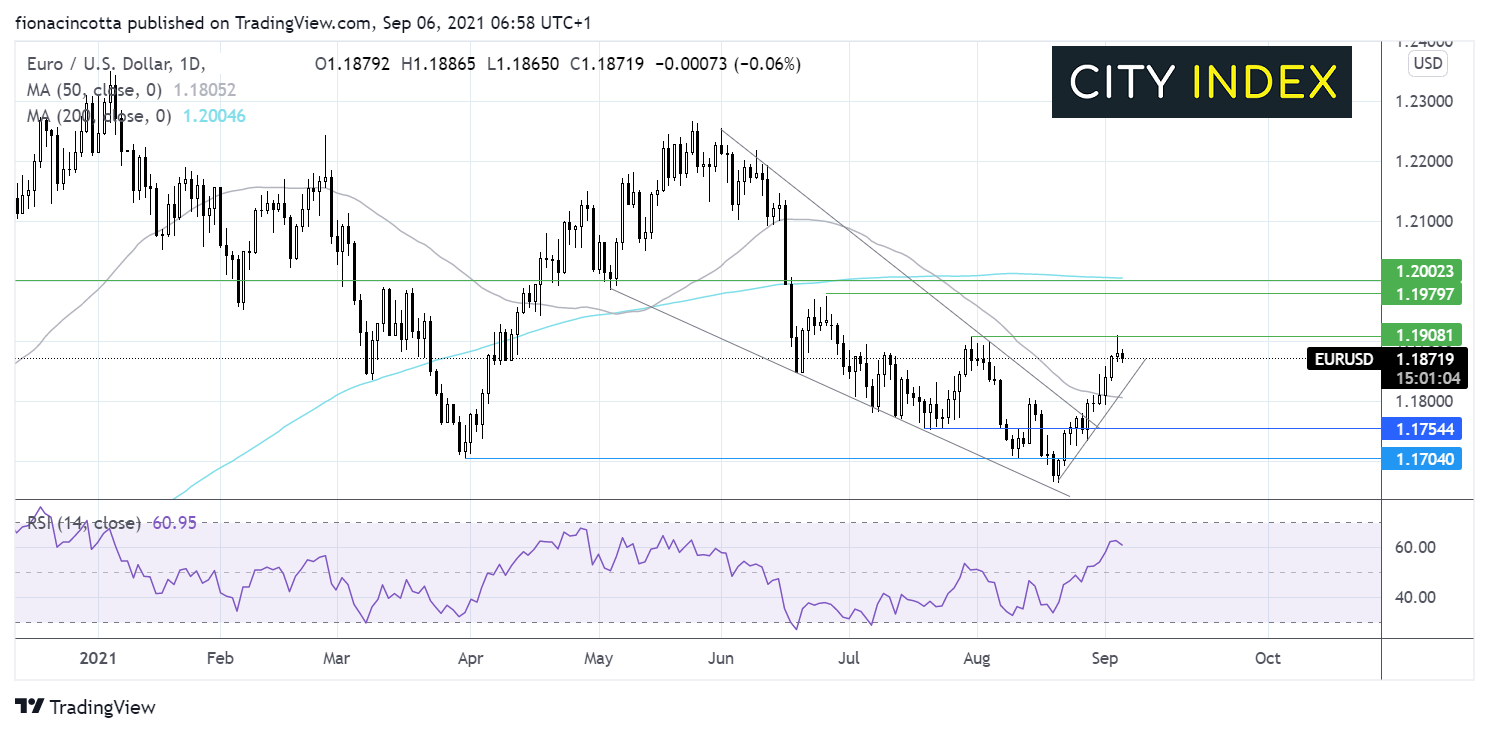 欧元/美元8月最后一周突破下降楔形并掉头冲高,攻向本月初同样封顶上行的1.1909。
