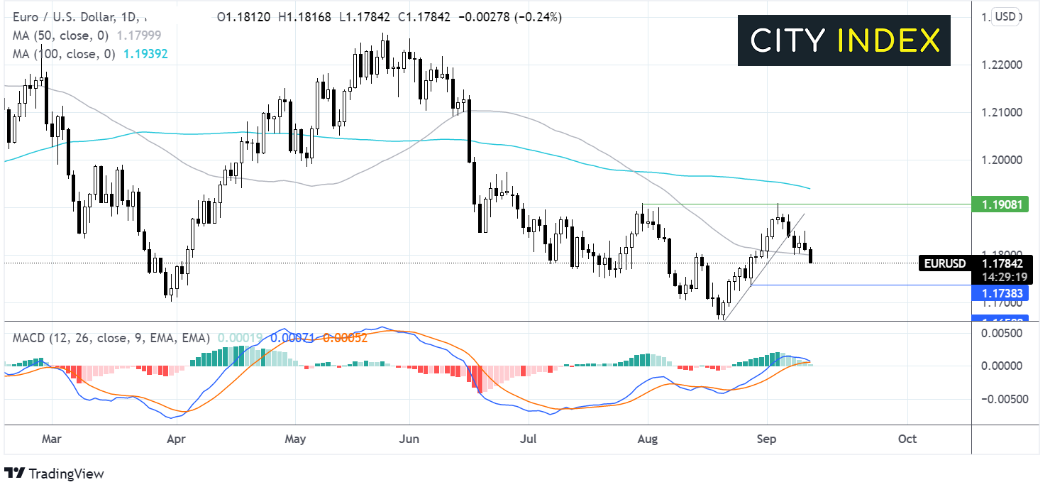 价格已跌穿50天均线所在的1.18,而MACD的看涨倾向减弱,空头因此看好扩大下行的前景,后市可能先后下探8月27日低点1.1740和8月低点1.1660。