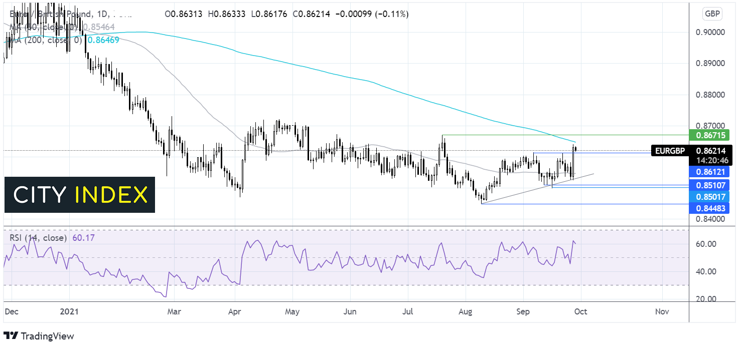 昨天,欧元/英镑的反弹在0.8641附近遇阻。欧洲早盘期间,汇价走低。若守住9月7日和23日高点0.8613处支撑,多头将仍对试探200均线0.8650保持希望。