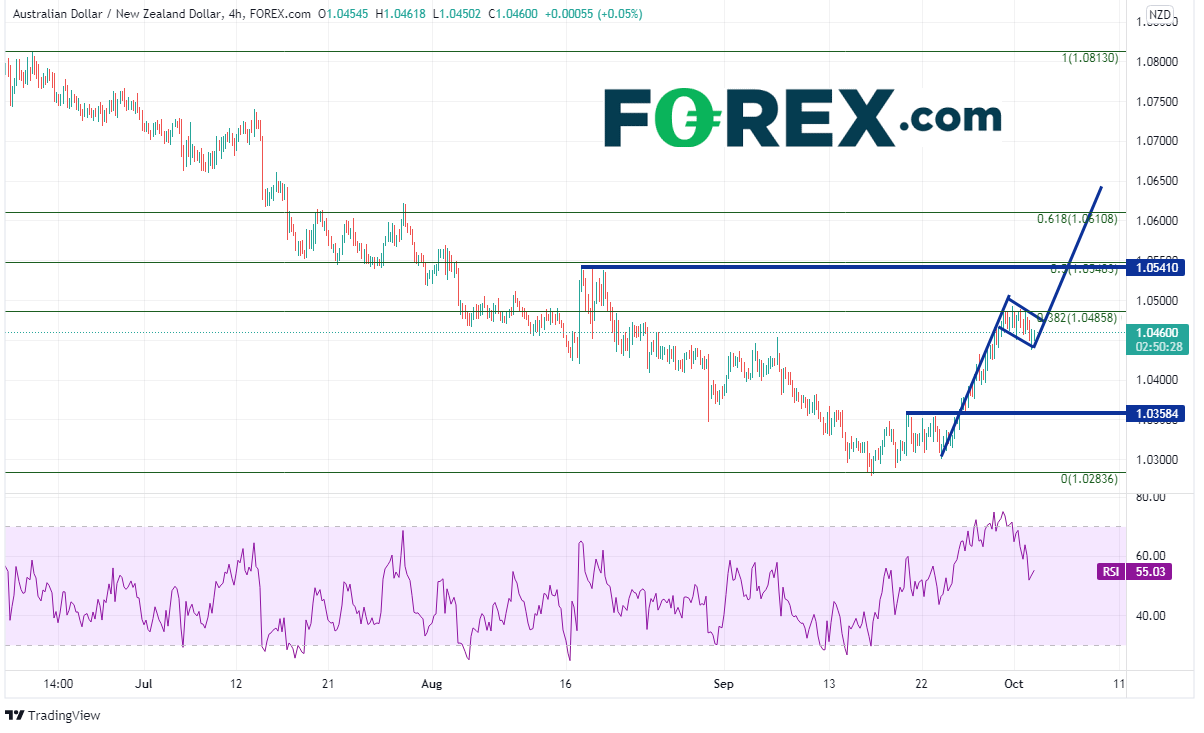 自6月中旬以来,澳元/纽元一直于有序通道中交投走低。7月16日,货币对跌破2020年8月中旬以来持续交投其间的对称三角形。澳元/纽元继续推低,并在1.0280附近触及疫情初期以来低点。9月16日,随着RSI逼近超卖区域,货币对触底反弹至6月21日高点-9月16日低点下行之38.2%斐波那契回档1.0484附近。货币对目前在该水平和50日移动均线1.0422之间交易。
