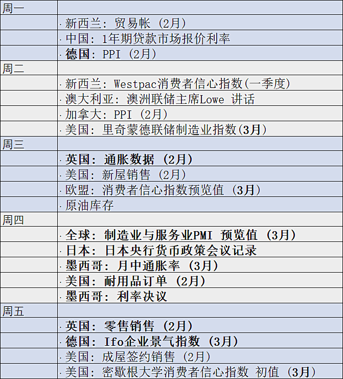 本周经济日历清淡,3月数据的发布时间在3月份比较分散。本周英国除了通胀数据外还将发布零售销售报告。本周将要揭晓的其它数据有澳大利亚、欧元区、英国和美国的PMI预览值。这些数据将初步透露制造业与服务业在俄罗斯入侵乌克兰与油价飚升后的变化情况。本周重要经济数据详情如下:
