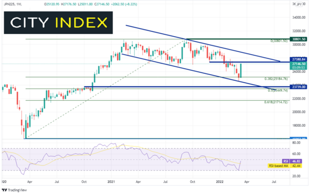 日经225指数上周上涨8.25%,斩获2020年3月以来最大涨幅。该大盘股指自2020年3月低点15997开始上涨,于2021年2月16日当周创下30724高点。经过回撤后于2021年9月测试前述高点并在30801.5形成略微上抬的新高。自那以后,该股指下跌并形成下降通道,考验了2020年3月低点到2021年9月高点行情的38.2%回档位,即25136.8附近,然后在上周强力回升。上方阻力有略高于当前价位的水平阻力位27380附近,然后是下降通道的上轨趋势线28800附近,接着是30801.5高点。支撑位在2周前以来低点24497,那也是前述通道的下轨趋势线,然后是由前高点和前述行情的50%回档位形成的支撑区间23459-23739,接着是61.8%回档位21714附近。