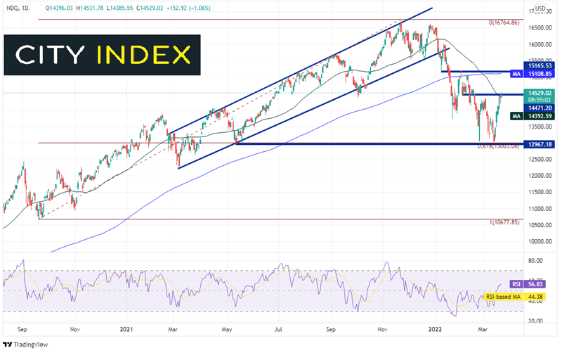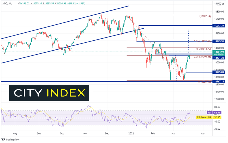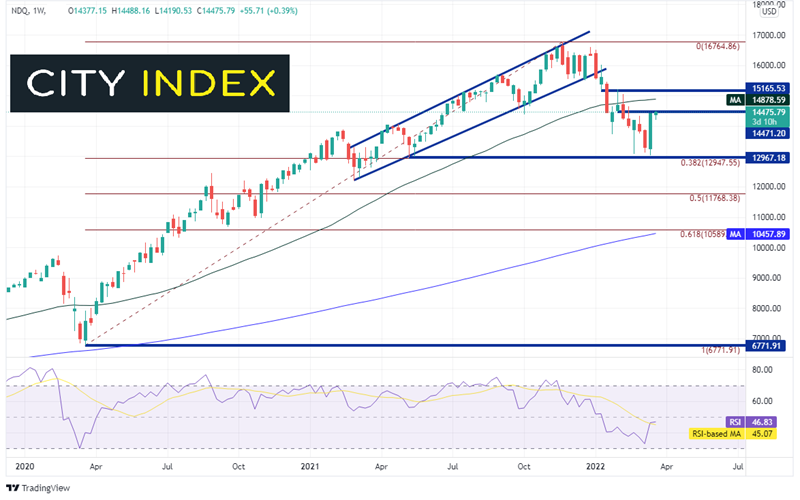 纳斯达克100指数自2020年3月低点强力反弹后回撤,技术面进入熊市但从周图看或许并非如此。请留意上档的阻力带,以及4小时图双底形态的目标,观察近期反弹是否可以延续。