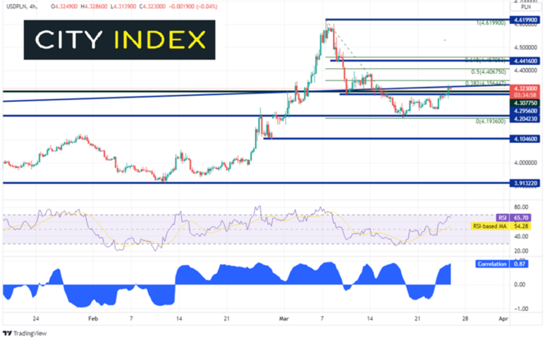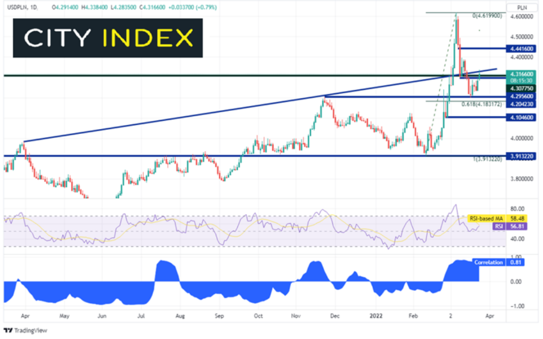 美元/波兰兹罗提和黄金之间存在高度正相关联系,目前两者的相关系数报在+0.81。高于+0.80的读数都被视为高相关性。美元/波兰兹罗提在俄罗斯入侵乌克兰后和黄金一样开始大举走高,于3月2日站上4.3078的前历史高点后攻城略地,在3月7日创下历史新高4.6199。该货币对此后回落至水平支撑位4.2042并且再度上扬。