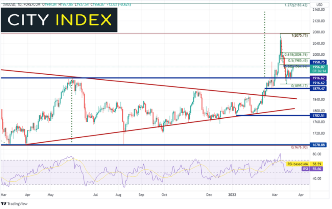 担心着俄乌冲突的投资者现在又添一层焦虑。美国总统拜登本周前往欧洲,与北约盟国商讨当前局势。双方会面后爆出的媒体头条显示,北约正在为发生俄罗斯核事件的风险做准备。拜登还跟北约说,支持北约在东线增派兵力。还有,此前有消息称,七国集团计划就俄罗斯使用化学武器和核武器对其发出警告。这些消息只会升级俄罗斯与西方国家之间的紧张关系,造成更多的不确定性。资金因此涌入黄金避险。