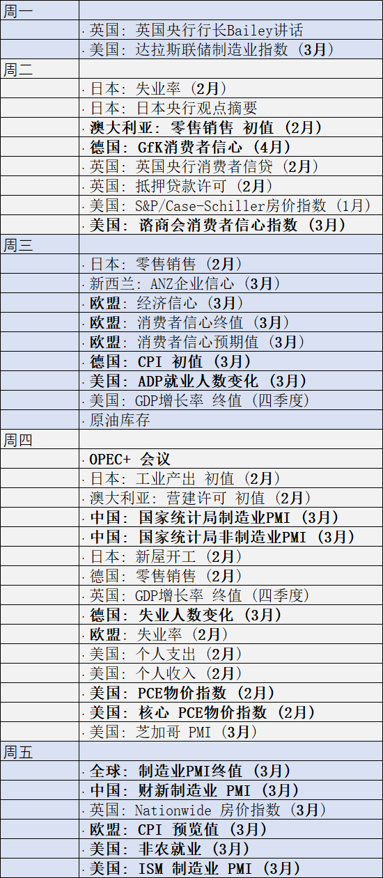 本周美国将发布美联储青睐的通胀指标,即剔除不稳定的食品与能源的核心PCE。该报告或一定程度增强美联储的信念。市场预期2月核心PCE年率为5.5%,高于5.2%的前值,亦可能是近40年最高点。美国本周还将揭晓非农就业报告,市场预期3月新增就业48.8万。请注意,上周公布的失业金申请人数仅有18.7万,创下1969年9月6日以来最低点。非农就业报告存在弱于预期的风险。另外,本周澳大利亚将披露零售销售、中国国家统计局将公布制造业与非制造业数据,而欧盟将发布3月CPI初值。本周重要经济数据具体如下: