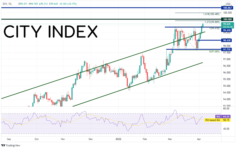 美元指数继续上攻100,上看第一阻力99.89,那是3月7日高点到3月30日低点行情的127.2%扩展位。如果攻克,可望上攻100.00的整数心理大关、前述行情的161.8%扩展位。下方支撑位在今天低点99.31附近、长期通道的上轨上斜趋势线99.00附近、水平支撑位98.43。