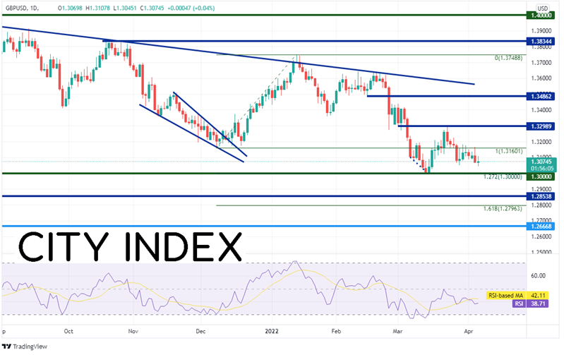 英镑/美元自1月13日在1.3788构筑短线高点后大幅度下跌,于3月14日考验了2021年12月8日低点到2022年1月13日高点行情的127.2%扩展位1.3000附近,但未能下破且反击1.3273附近的阻力位。该货币对眼下正在下挫,似乎再度考验1.3000。如果成功下破,可能先后下看2020年11月以来水平支撑位1.2854、前述行情的161.8%扩展位1.2793附近。阻力位在3月23日高点1.3298、水平阻力位1.3486。