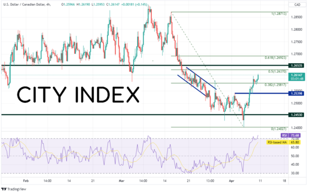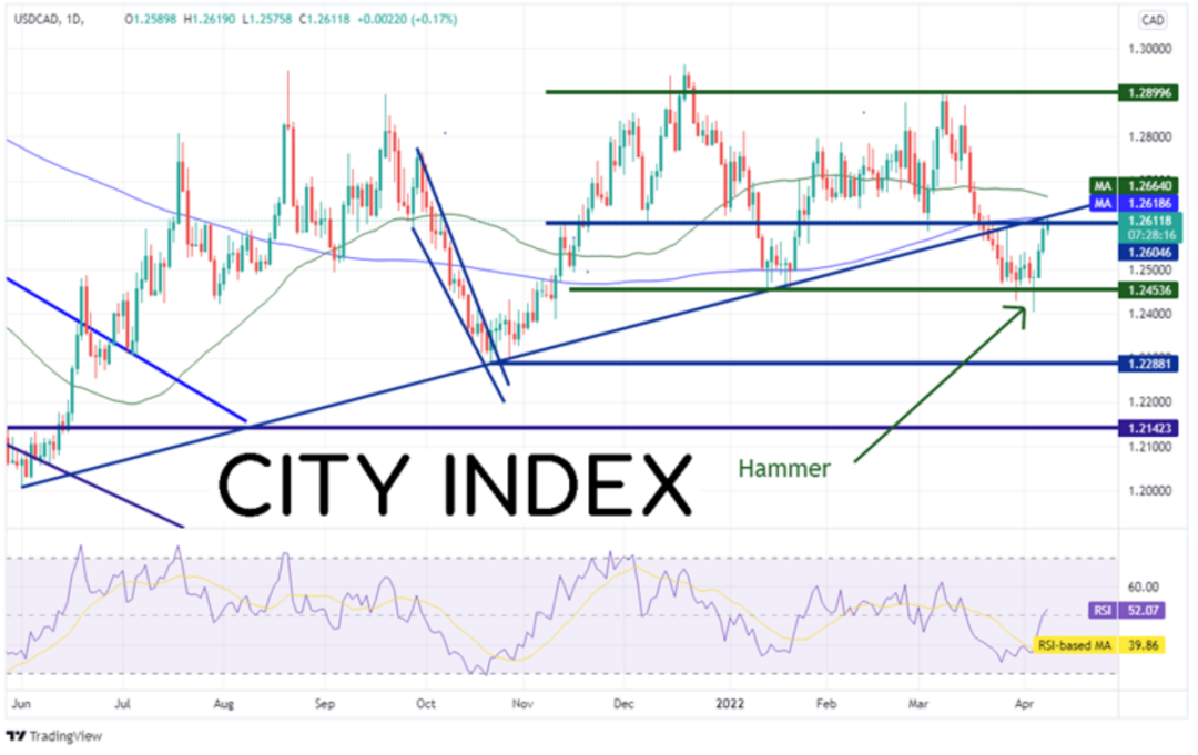 美元/加元自2021年11月中旬以来一直交投于1.2450-1.2900(请看绿色线)区间,于12月中旬尝试击穿该横盘通道的上轨,最近则在上上周试图下破通道下轨,但均以失败告终。价格在4月5日形成锤子形态后不断走高,目前交投于水平阻力位、2021年6月1日以来上斜趋势线与200天均线附近,即1.2620一线。