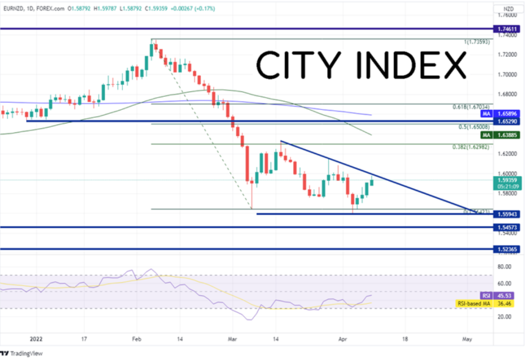 欧元/纽元4小时图脱离最新低点,摸至3月15日高点到4月5日低点行情的50%回档位,即1.5970附近,其略低于三角形的下降趋势线。上方其它阻力位有前述行情的61.8%回档位、水平阻力位1.6148和3月15日以来高点1.6340。下方支撑位有水平支撑位兼4月5日低点1.5600附近、2017年以来低点1.5457 和 1.5237。