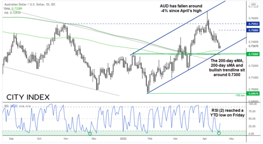 美联储为平抑飞涨的通胀而加息,或致美国经济衰退。这样的担心或引导市场今年视情况重新评估较大幅度加息的可能性。大宗商品继续构成澳元的利多,且澳元/美元4%的回调正逼近关键支撑区域。