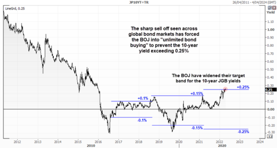 日元急跌,但日本央行出手阻止的可能性似乎不大,主要原因可能就在其收益率曲线控制政策。2016年以来,央行一直控制10年期政府债券的收益率,一开始控制在+/- 0.1%区间内,之后将这个区间扩大至+/- 0.25%。
