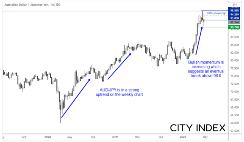 我们可以看到澳元/日元周图自创下2020年低点后就一直处于强劲的上涨趋势中,而且2022年上涨动能增强,有望最终站上96后再上台阶。然而,价格在2016年收盘高点下方不远处形成了看跌锤子形态,之后在上周下跌,现在进入回调阶段 – 可预见未来或交投于90-96区间。