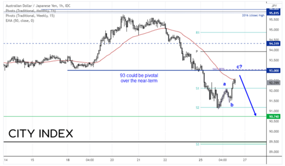 小时图显示,自本周低点以来价格构筑了3浪波动,但于50小时指数移动均线处遇阻。一旦价格下破92,则意味着修正高点或已就位,后市可能下破90.74支撑位。但考虑到股市上涨的事实,价格短线拥有扩大涨势、上攻93.0的潜力。如果触顶信号落实,价格或自93.0回落。