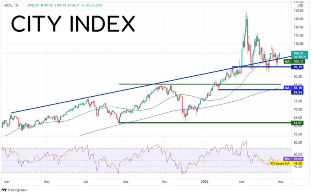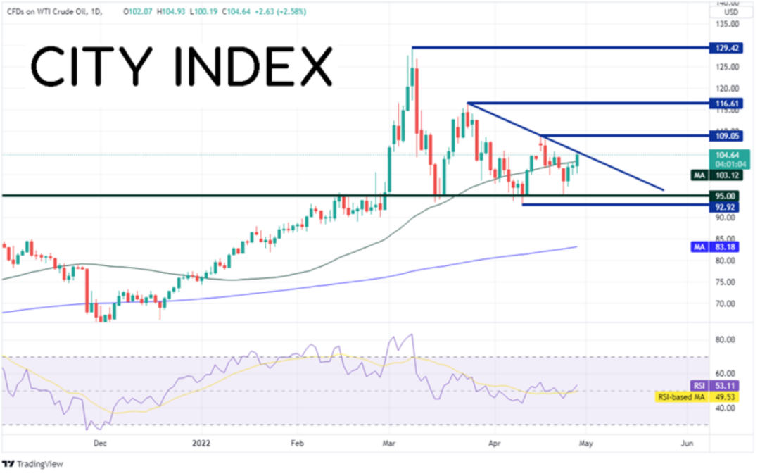 欧盟终于准备不再进口俄罗斯原油了吗?欧盟此前和其它部分国家一起一直不支持禁运,但周四有媒体报道,德国现在准备不再自俄罗斯购买原油。欧盟接下来必须找到新的能源进口来源,这点帮助西得州原油和布伦特原油今天涨逾2.5%。