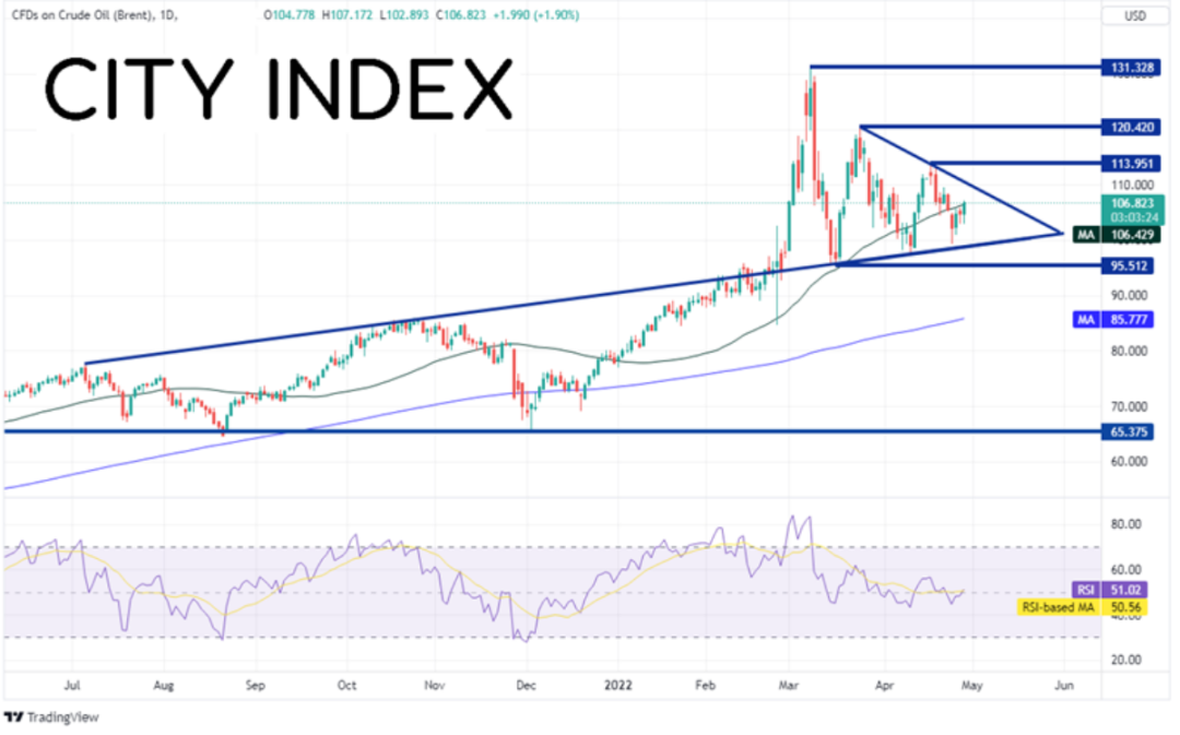 4小时图上油价正在进攻扮演第一阻力位的、3月23日以来的下降趋势线,如果站于其上,可望先后上探109.05和116.16的水平阻力位以及3月8日高点129.42。第一支撑位在今天低点兼日图上升趋势线所在的100.19,然后是4月25日低点95.25、4月11日长下影线低点92.92。