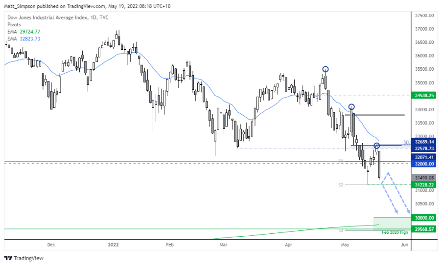 今天还不清楚是直接下破31,228支撑位抑或在突破支撑位前先小级别反弹。如果受制于32,000,则我们继续看跌,第一步下看30,000。但在下跌动能增强的带动下,股指甚至可能回到200周指数移动均线所在的29,600附近,即2020年2月高点附近。