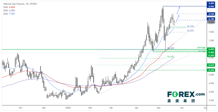天然气价格日图依然处于强劲的上涨趋势中,周四和周五两天虽然稳定回撤,但守住了20天指数移动均线和38.2%回档位。如果站上周五高点,后市或延续上涨行情,先后上看8.548和9.00附近。