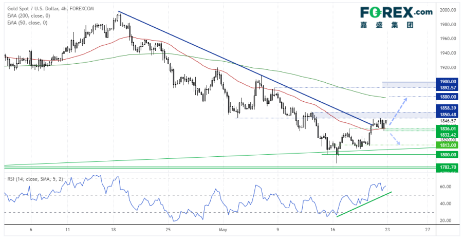 黄金4小时图:上周突破下跌趋势线