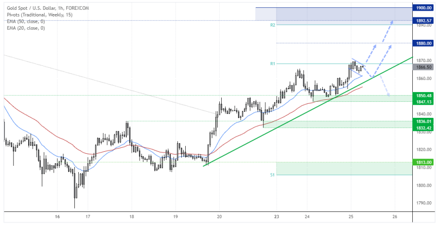 如果价格没有突破反而回撤,那么上涨趋势线或提供支撑,我们也将寻找新的看涨结构。如果攻克前述趋势线,或面临回落至1850的风险。