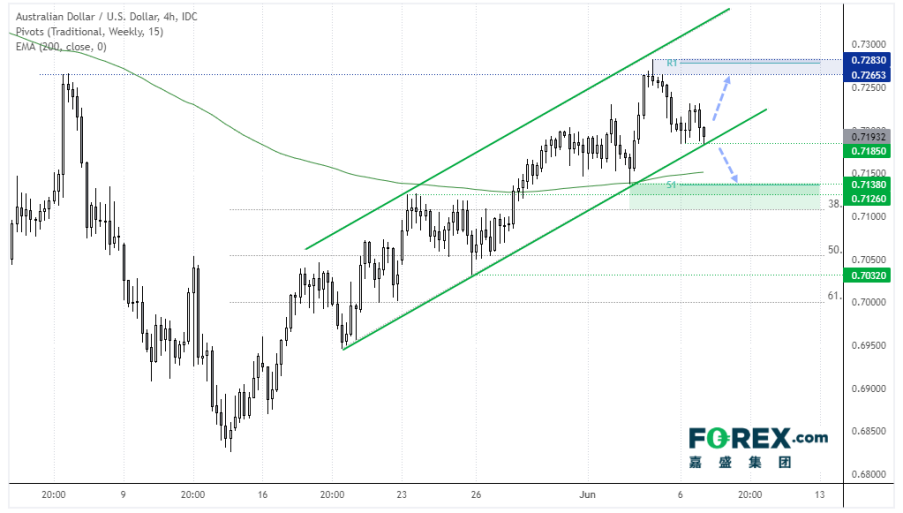 澳元/美元昨天在200天指数移动均线处遇阻,并且随机震荡指标在6月1日发出沽售信号。4小时图价格当下交投于上涨通道内,但已形成了一个下降的高点并正在考验通道下轨。在澳洲联储会议召开之前,澳元/美元或许较为平静。而在货币政策宣告之后,0.7200一线可能决定着价格的涨跌。