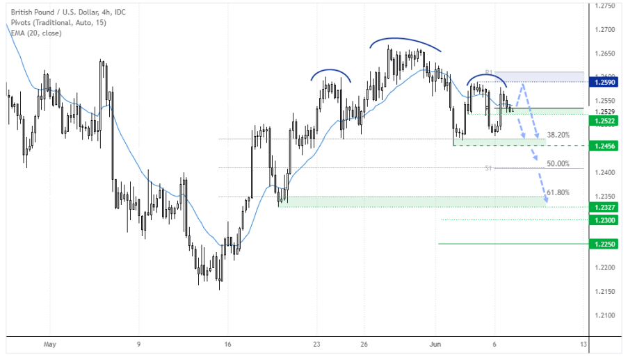 价格下破1.2456,确认了昨天报告中提到的头肩顶形态。但过去12小时发生的政治事件令价格在1.2500 - 1.2600区间内徘徊,使其目前报在区间中轨上下。如果守住1.2530支撑区域,多头可望逢低买入并上看1.2590高点。但在英国首相人望不足的环境中,我们或考虑寻找1.2590阻力区域附近的看跌结构。