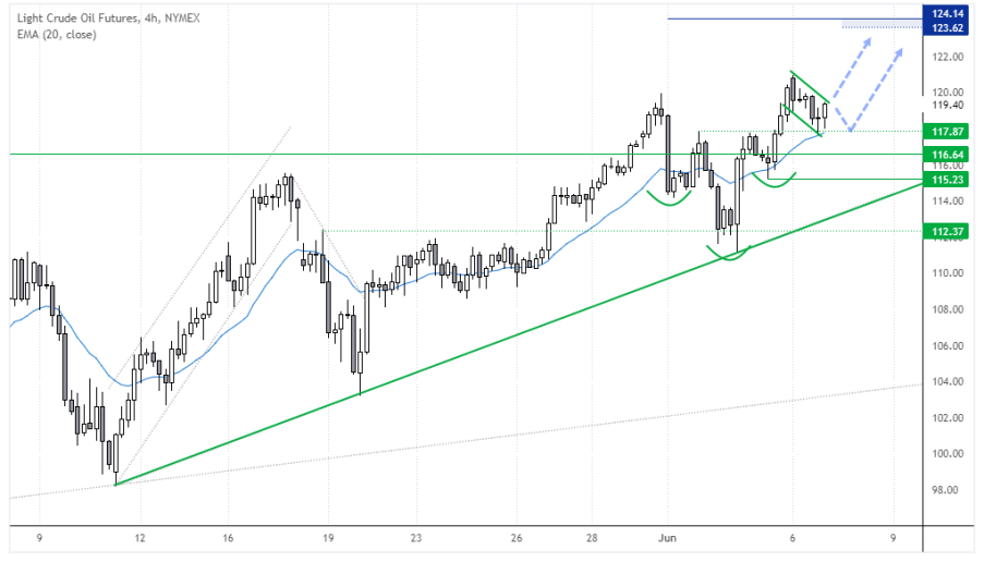 保持头肩底形态完好的前提可能是价格守住昨天低点,如果直接突破小级别回调线,或确认该看涨旗形形态。而鉴于整体趋势的强度,我们乐于探索116.64上方的看涨结构,目标分别为120和124。