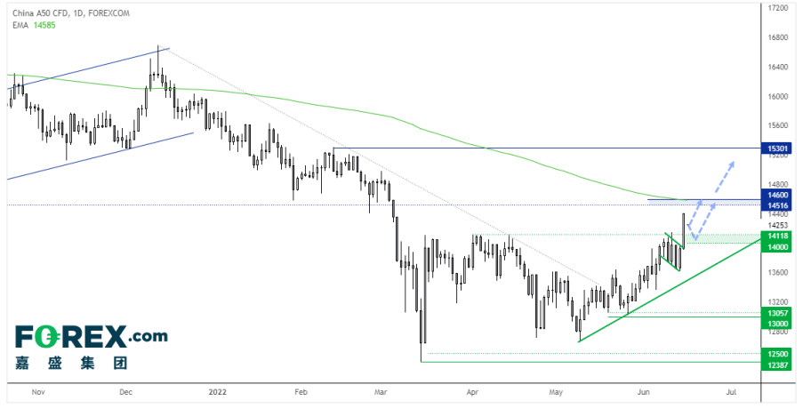 该指数当天低开高收,终于长阳收上14,000,叠加上破看涨旗形形态,现在上涨动能增强,后市上看200天指数移动均线附近的14,600阻力区域,站于其上重点关注15,000。守住14,000,我们继续看涨。