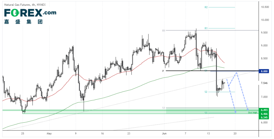 价格自周图第2支撑中枢回调,和我们昨天想的一样,目前上档面临破败趋势线阻力。但即使继续反弹,也可能遭遇8.00的强阻力。加上油价隔夜下跌,天然气价格今天可能跳空下挫。我们的看跌目标在6.50支撑区域。