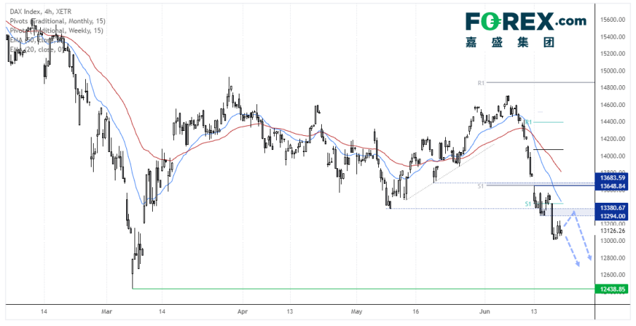 全球投资者继续看跌股市,或利空德国DAX指数后市。该股指4小时图形成了强有力的下跌趋势,但目前盘整于上周低点附近。受制于13,380阻力区域继续看跌,我们可能在该位之下寻找看跌机会。如果下破上周低点,或延续跌势。